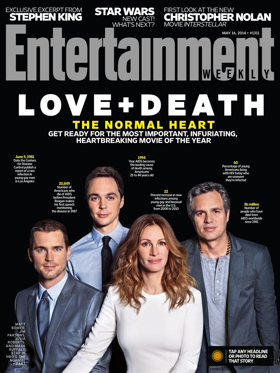 HBO推出的《平常心》根据托尼奖同名获奖百老汇话剧《The Normal Heart》改编,讲述了上世纪八十年代的纽约同性恋人群艾滋病以及HIV携带者的生活,大致都是Larry Kramer的人生经历和感悟。马克·鲁法洛将扮演男主角Ned Weeks——当时被称为“同性恋癌症”的艾滋病在纽约开始肆虐时,首先一批被予以关注的患者;朱莉娅·罗伯茨将在电影中扮演Emma Brookner——一个下身残疾坐在轮椅上的医生,艾滋病在纽约出现伊始为数不多严肃看待此事的医生之一; 鲍德温将扮演Weeks的哥哥——一位十分纠结于兄弟的性取向的律师;`孔雀`波莫的角色名为Felix Turner——一个同志时尚记者,后来成了Week的男朋友,不幸同样染病;“谢耳朵”吉姆·帕森斯将会重新演绎自己在百老汇版中的角色——一个同性恋活动家,同时也是男同志健康危机组织的一员……